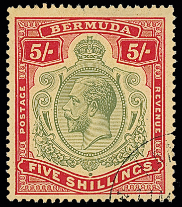 343 Used imageBermuda: 1918-22 Watermark Mult. Crown CA 5s. green and carmine-red on pale yellow, with damaged leaf at bottom right, fine used. S.G. 53df, unpriced. Photo. (Image1)