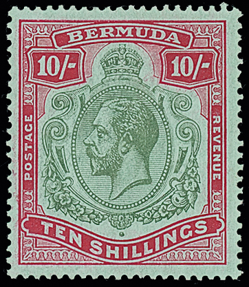 358 nh imageBermuda: 1924-32 Watermark Mult. Script CA 10s. green and red on pale emerald, variety broken crown and scroll mint. S.G. 92b, cat. £700. Photo. (Image1)