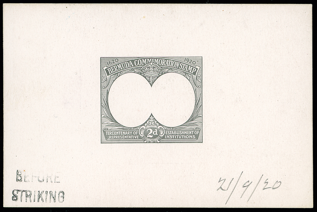 345 imageBermuda: 1920-21 Tercentenary 1/2d. die proof of frame in black on glazed card (92 x 60mm), endorsed “BEFORE/STRIKING” and dated “21/9/20”. Photo. (Image1)