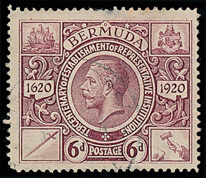 347 Used imageBermuda: 1921 Tercentenary, Watermark Mult. Crown CA 6d. purple, showing variety “A” of “CA” missing from watermark, lightly cancelled, one or two minor imperfections, otherwise fine. S.G. 72b, unpriced used. Photo. (Image1)