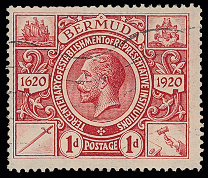 348 Used imageBermuda: 1921 Tercentenary, Watermark Mult. Script CA 1d. deep carmine watermark sideways inverted and reversed, good used, some trimmed perfs. at top. S.G. 76y, cat. £700. Photo. (Image1)