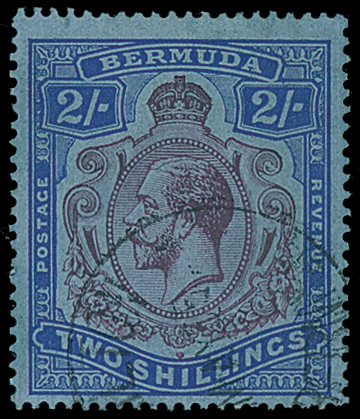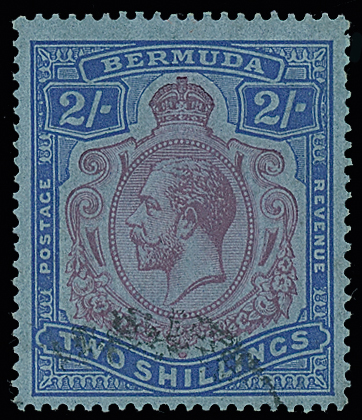 352 Used imageBermuda: 1924-32 Watermark Mult. Script CA 2s. purple and blue on grey-blue, variety break through scroll, used, fine. S.G. 88gd, cat. £550. Photo. (Image1)