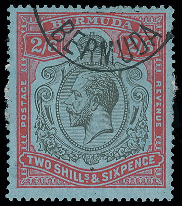 354 Used imageBermuda: 1924-32 Watermark Mult. Script CA 2s.6d. black and carmine on pale blue, variety damaged leaf at lower right, used, adhesions on reverse, fine. S.G. 89f, unpriced used. Photo. (Image1)