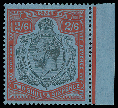 355 nh imageBermuda: 1924-32 Watermark Mult. Script CA 2s.6d. black and scarlet-vermilion on deep blue, variety broken crown and scroll, mint marginal example, fine. S.G. 89jb, cat. £450. Photo. (Image1)