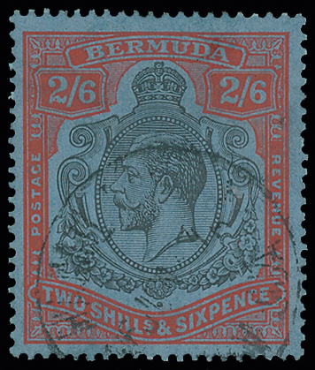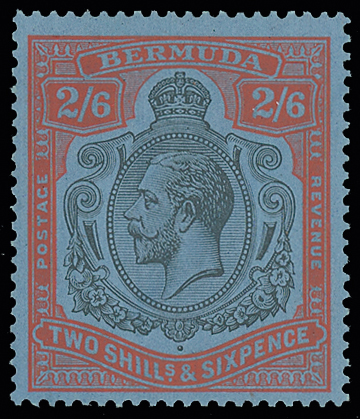 357 nh imageBermuda: 1924-32 Watermark Mult. Script CA 2s.6d. black and bright orange-vermilion on deep blue, mint, fine. B.P.A. certificate (2002). S.G. 89k, cat. £3,250. Photo. (Image1)
