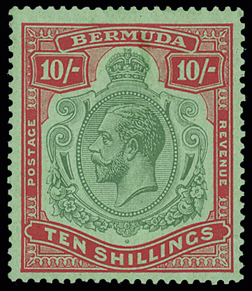 360 Used imageBermuda: 1924-32 Watermark Mult. Script CA 10s. green and red on deep emerald, variety damaged leaf at bottom right, used, fine. S.G. 92gf, unpriced used. Photo. (Image1)