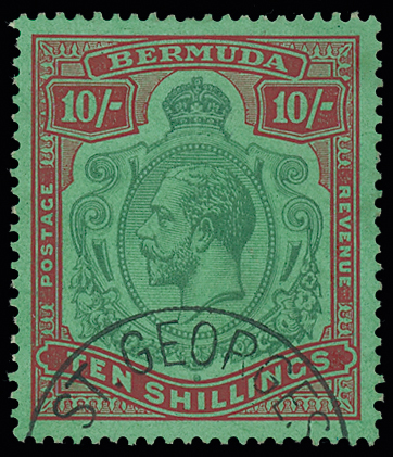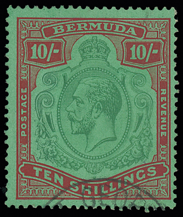 359 Used imageBermuda: 1924-32 Watermark Mult. Script CA 10s. green and red on deep emerald, variety broken crown and scroll, used, fine. S.G. 92gb, cat. £900. Photo. (Image1)