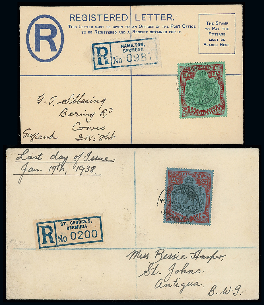 353 c, entire, etc. imageBermuda: 1924-32 Watermark Mult. Script CA 2s.6d. used on last day of issue on 1938 (Jan. 19) cover, registered to Antigua, also 10s. used on 1936 (Mar. 31) 3d. registered stationery envelope to Isle of Wight. S.G. 88, 93. Photo. (Image1)