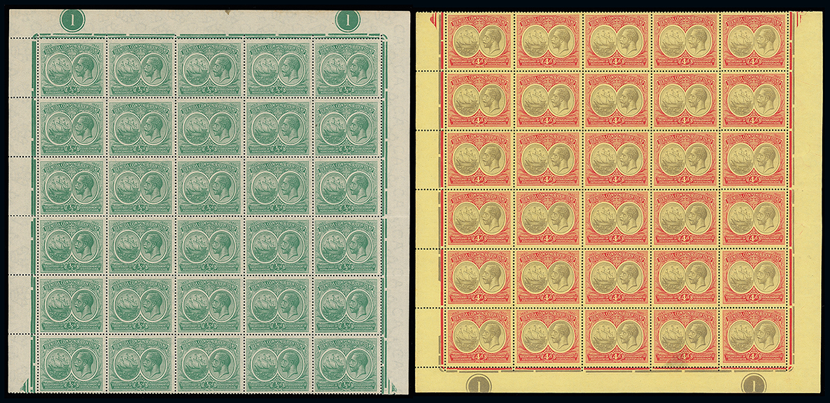 346 Unmounted bl imageBermuda: 1920-21 Tercentenary 1/2d. green and 4d. black and red marginal plate blocks of 30, the former from the top of the sheet and the latter from the foot, unmounted mint, one 4d. with small fault otherwise mainly fine. S.G. 60, 63. Photo. (Image1)