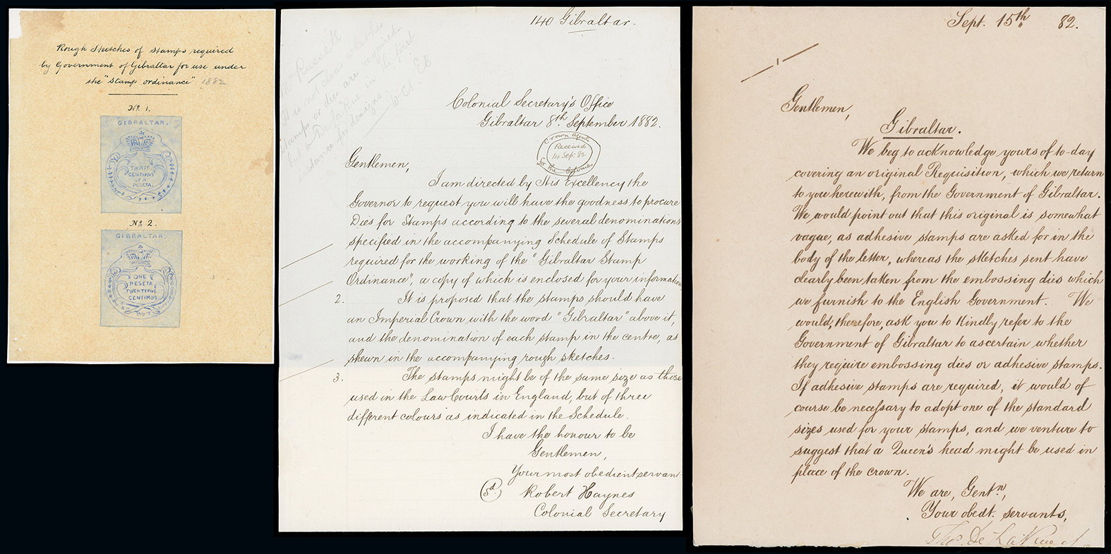 1072 imageGibraltar: Revenues: Stamp Duty: 1882 unadopted composite essay - 30c. and 1p.25c. hand-painted rough sketches of crown design on tracing paper (120 x 170mm), inscribed “Rough sketches of stamps required by government of Gibraltar for use under the ‘stamp ordinance’, minor corner faults. A unique exhibition item with two De La Rue archived copies of letters related to this essay. Photo. (Image1)