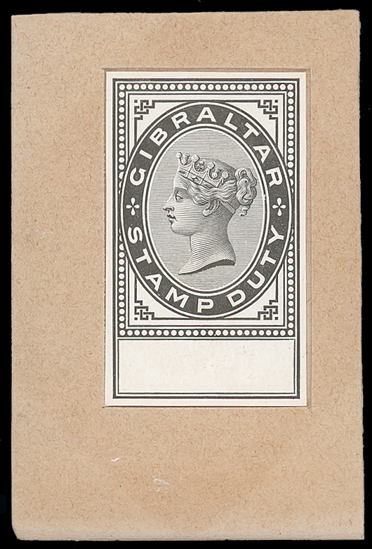1073 imageGibraltar: Revenues: Stamp Duty: 1884 die proof in black with blank value tablet on glazed paper, sunken on small thick card (42 x 64mm), made as a presentation key plate example for the Governor of Gibraltar. (Image1)