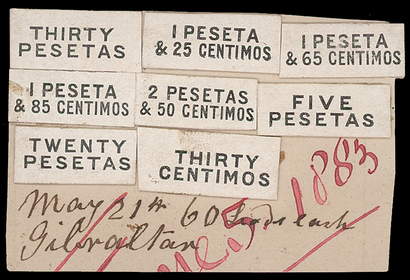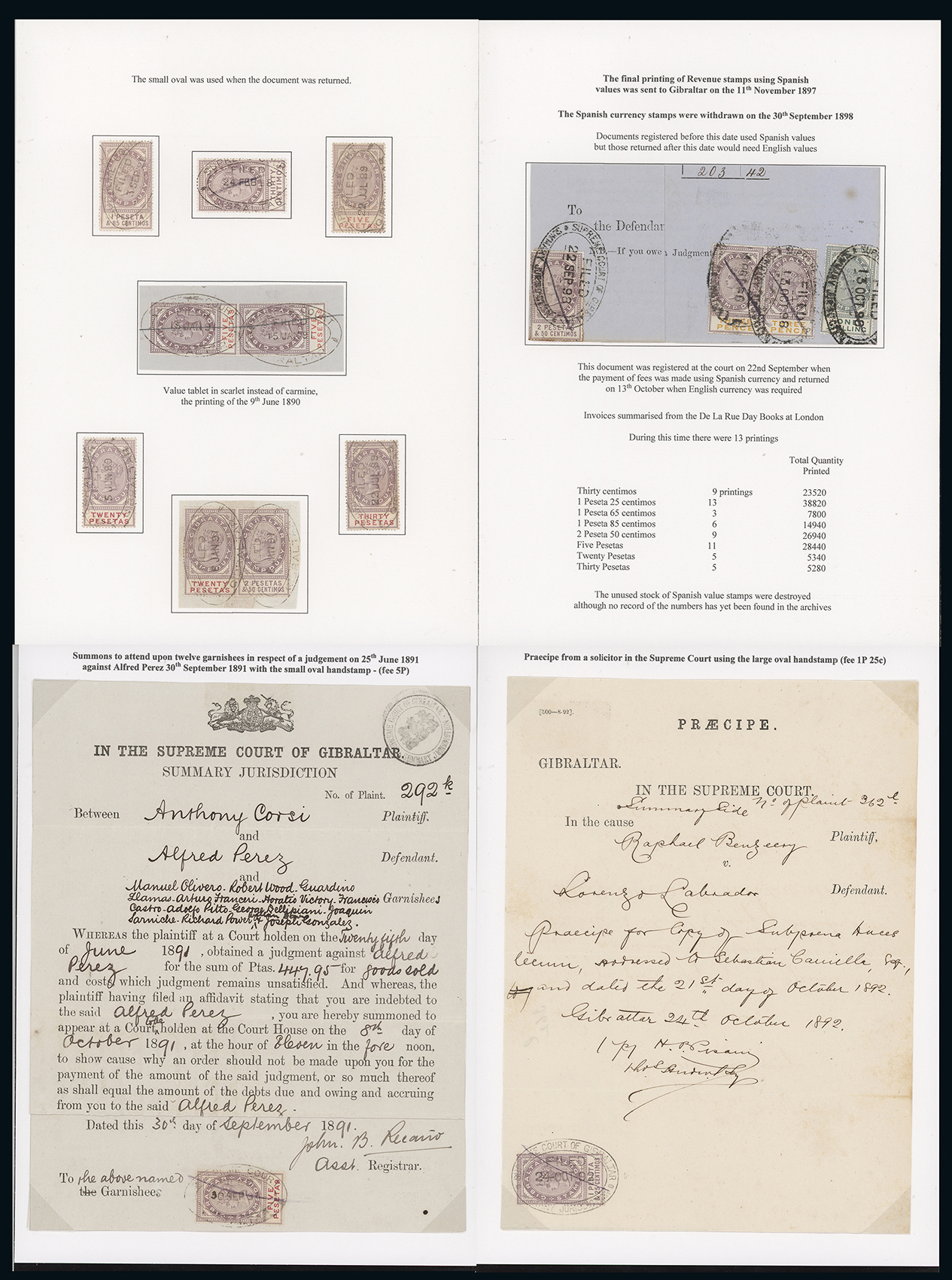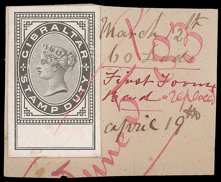 1081 Used imageGibraltar: Revenues: Stamp Duty: 1884, a collection of issues used with oval handstamps, incl. values to 20p. (2) and 30p., stamps on pieces incl. with manuscript “Spoilt stamps”, four documents, 1898 part document with Spanish value 2p.50c. and English values 3d. pair and 1s. etc., fine. (10 + 4 documents) (Image1)