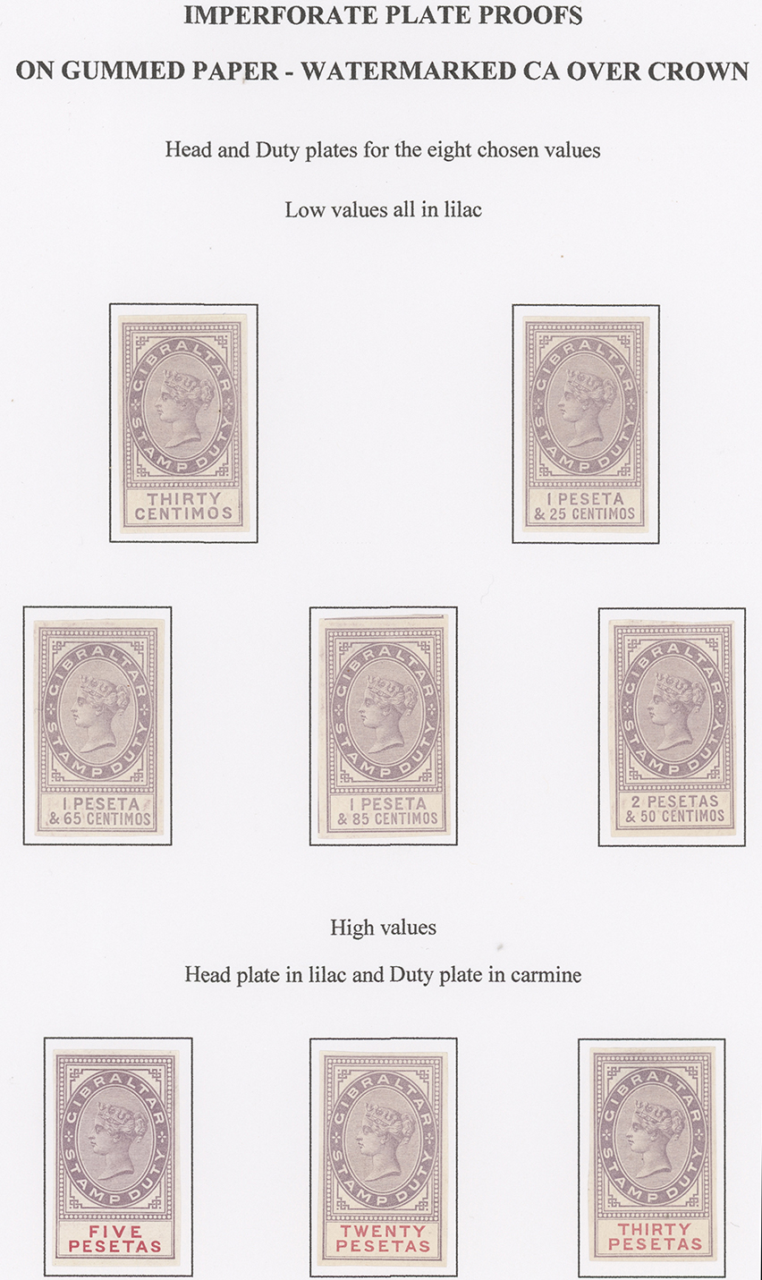 1076 imageGibraltar: Revenues: Stamp Duty: 1884 30c. to 30p. imperf. plate proofs set on gummed paper, mainly fine. (8) Photo. (Image1)