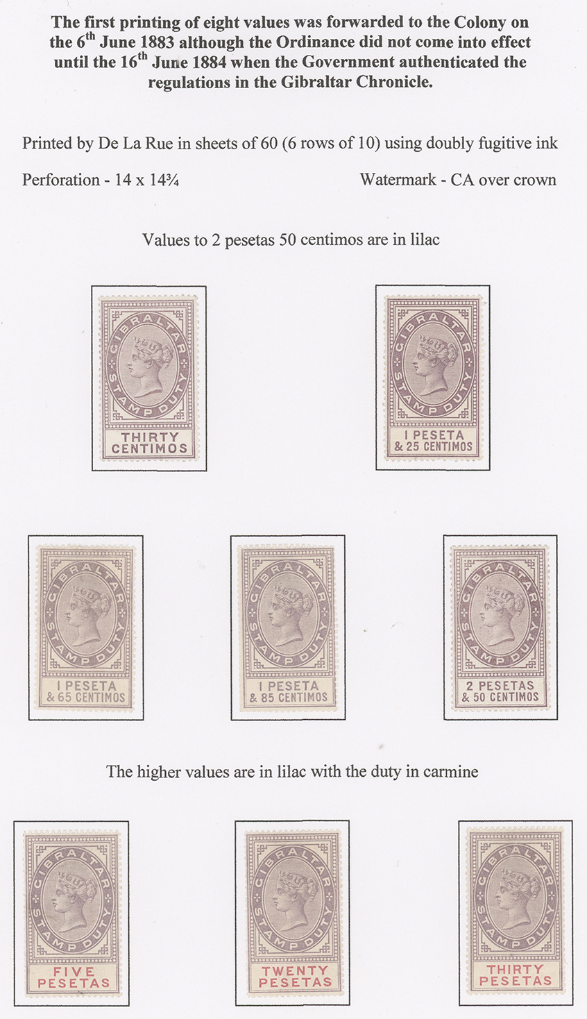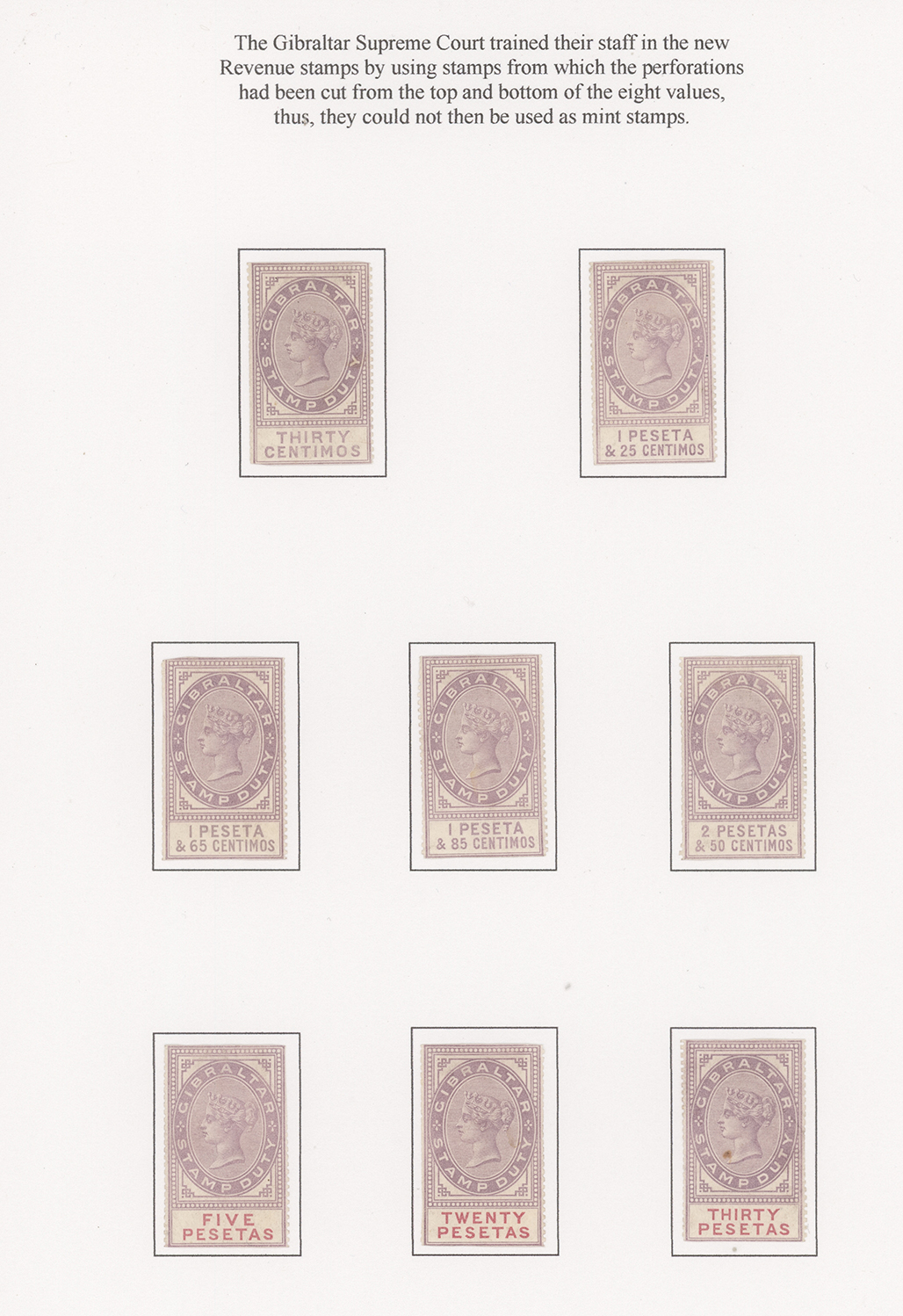 1075 imageGibraltar: Revenues: Stamp Duty: 1884 eight cut down duty plates imperf. die proofs in black on glazed paper, values from 30c. to 30p., pasted on piece from the De La Rue record book, with manuscript “May 21th 60 leads each Gibraltar” and dated “June 5 83”. A unique exhibition item. Photo. (Image1)