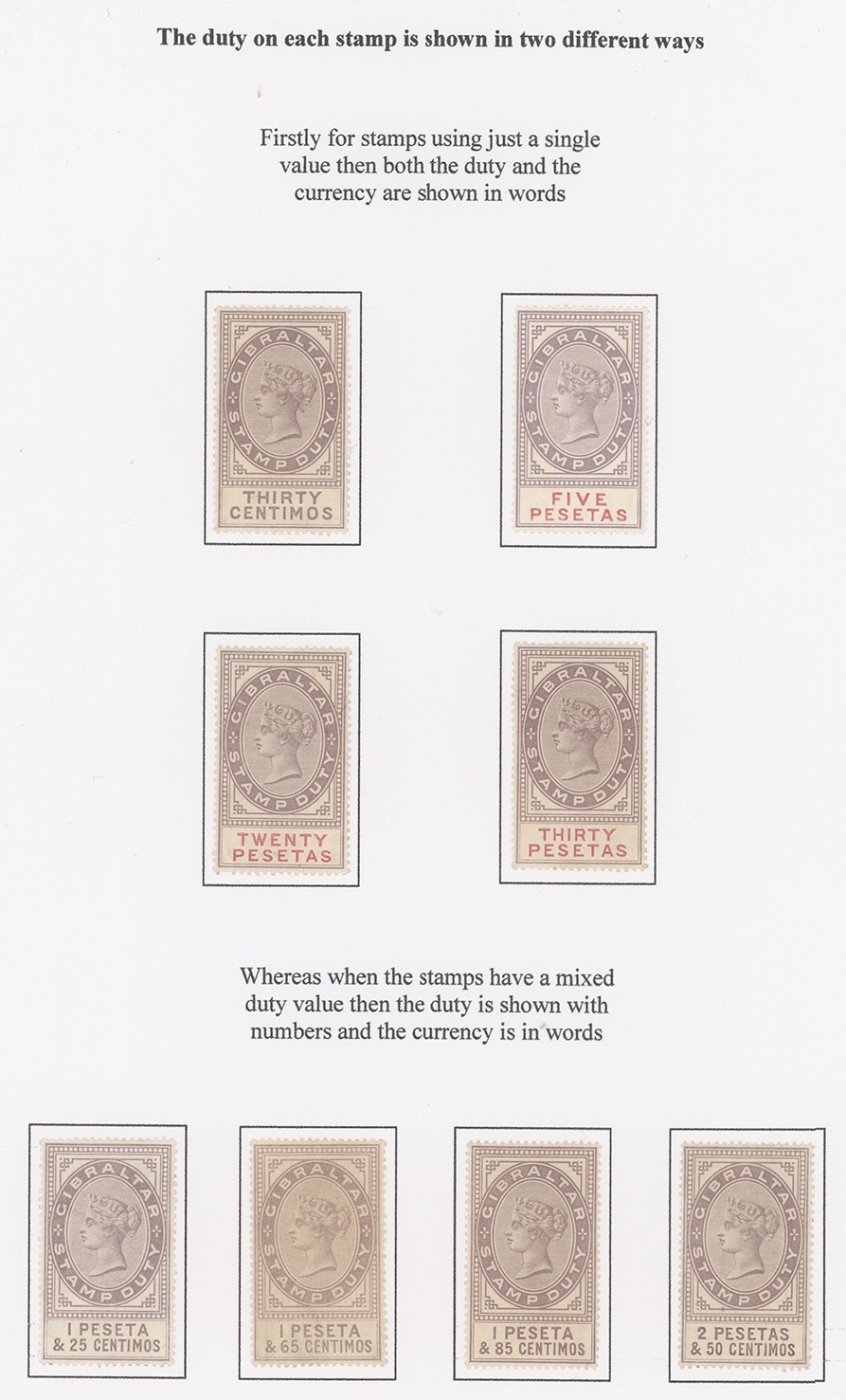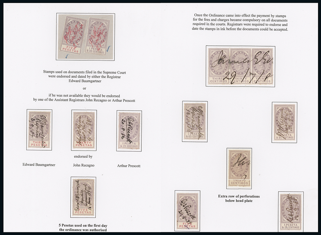 1082 Used imageGibraltar: Revenues: Stamp Duty: 1884 used collection on leaves, incl. 30c. with double perfs. and strip of three, 1p.25c. (2), 1p.65c., 1p.85c., 5p. (2, one used June 16 1884, first day of issue), 20p. and 30p., also a piece with 1p.85c. and 5p., with identified manuscript dated cancellations, mainly fine. (14) Photo. (Image1)