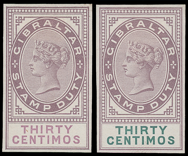 1077 imageGibraltar: Revenues: Stamp Duty: 1884 30c. imperf. colour trials with value in green and in lilac (issued colour) on ungummed unwatermarked paper. (2) Photo. (Image1)