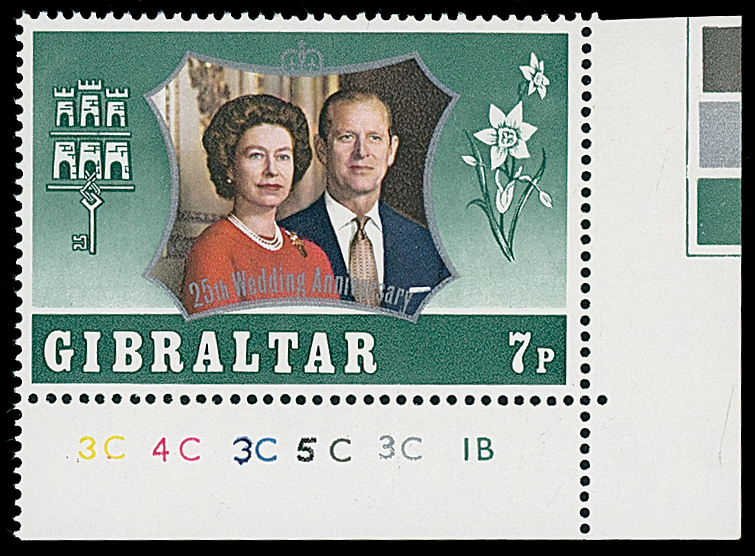 1066 Unmounted imageGibraltar: 1972 Silver Wedding 7p. watermark inverted, lower right corner marginal with cylinder nos., unmounted mint, fine. R.P.S certificate (1989) when in block of four. S.G. 307w, cat. £550. Photo. (Image1)