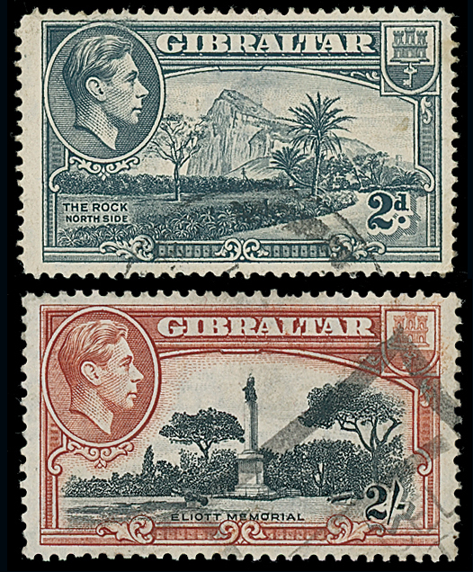 1064 Used imageGibraltar: 1938-51 2d. grey perf. 14 with variety ‘ape on rocka, also 2s. perf. 13 both used, 2d. has thin, 2s. with parcel cancellation. S.G. 124aa, 128bb. Photo. (Image1)