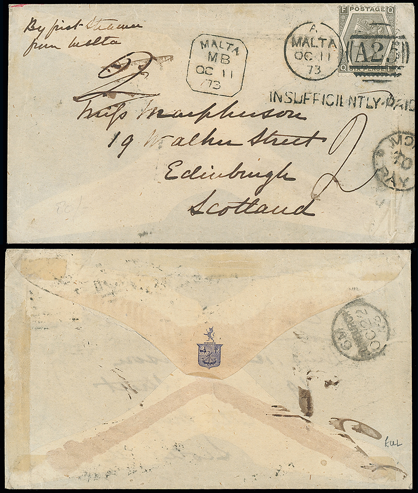 Malta: Moveable Box Marks: 1873 (Oct. 11) envelope “By First Steamer/from Malta” to Edinburgh franked 1873 6d. plate 12 tied by “A25” duplex posted in the Moveable Box with “MALTA/MB” datestamp,