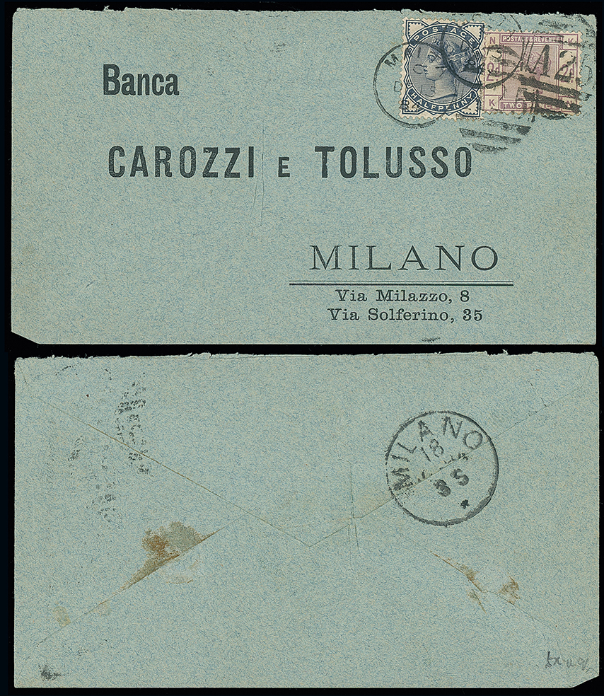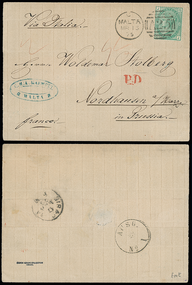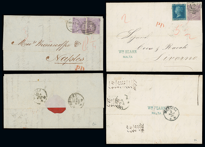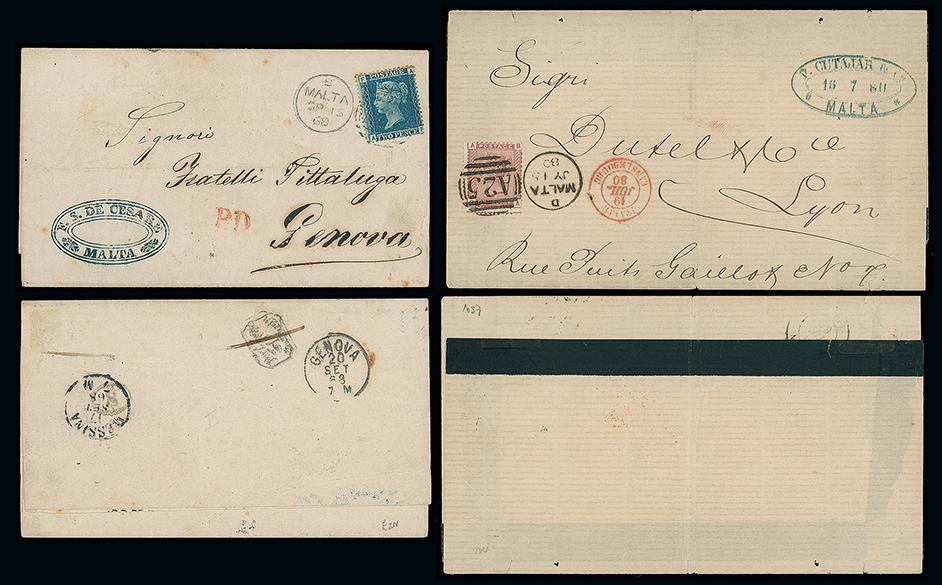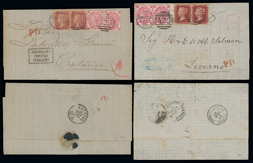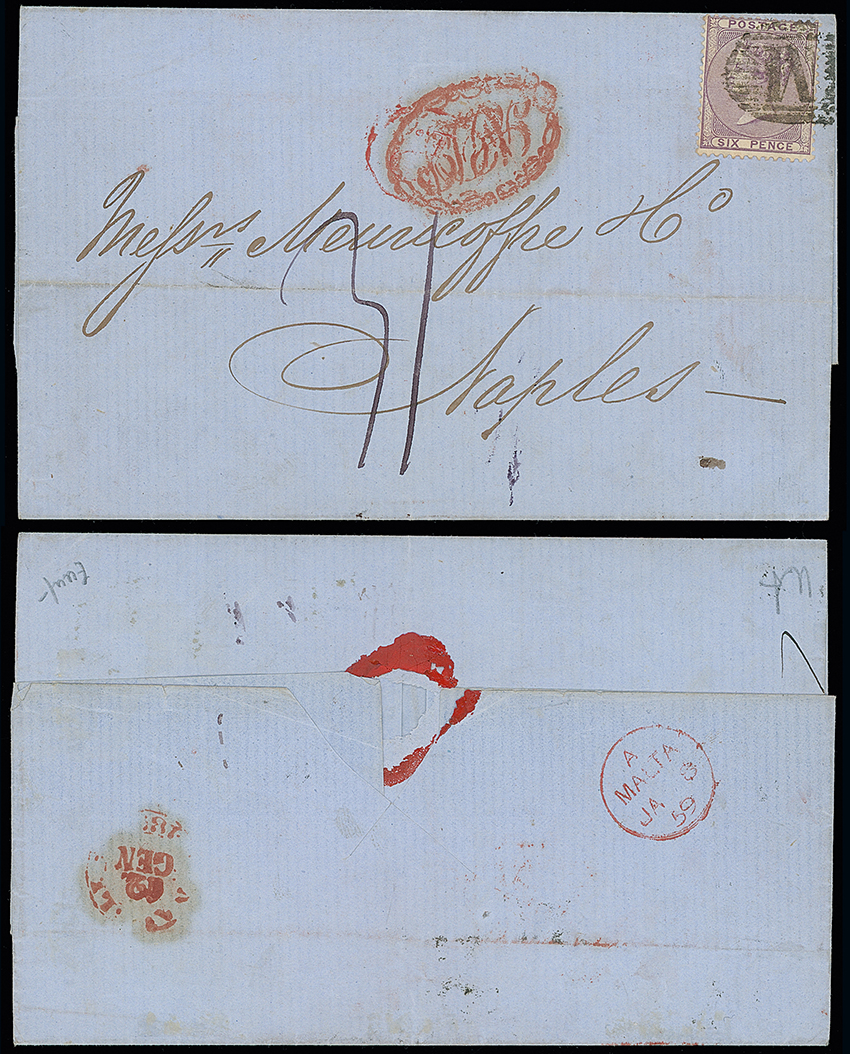 Malta: A25 Cancellations: Covers: 1869 (Mar. 19) entire letter to Rome franked 6d. plates 6 tied by “A25” duplex with scarce “43/4” accountancy and “P.D.” marks in red and the reverse with Syracuse and Naples