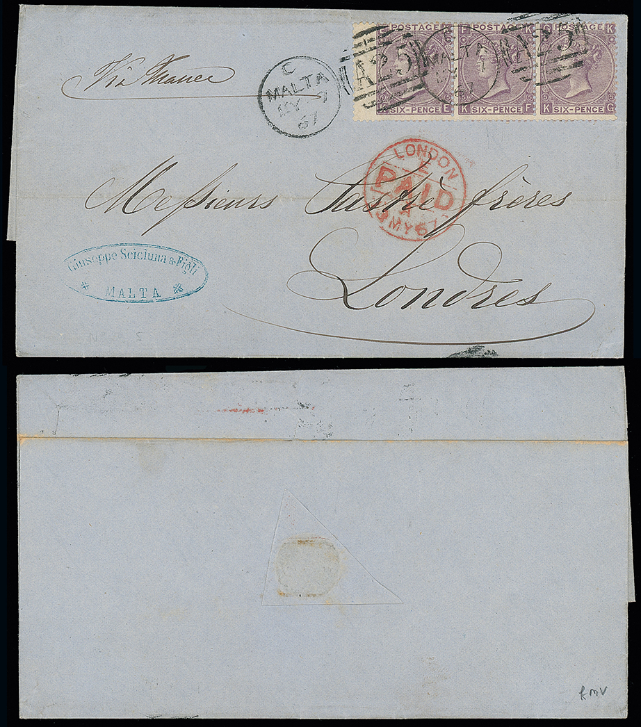 Malta: A25 Cancellations: Covers: 1867 (May 7) triple weight entire letter “via France” to London franked 1865 6d. strip of three (wing margin) tied by “A25” duplexes and with London Paid, scarce multiple on a