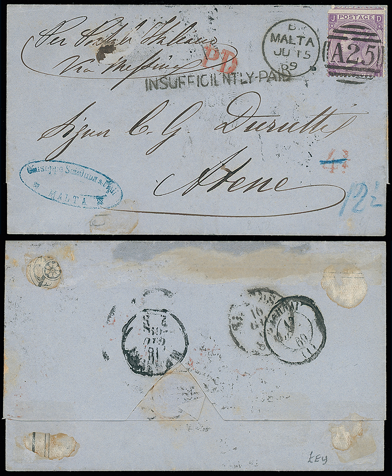 with “INSUFFICIENTLY-PAID” mark directly below, “43/4” accountancy mark in red deleted and with manuscript “121/2”(cents) (11/4d.) credit to Malta. Syracuse, Messina and Athens datestamps on the reverse, very unusual. Photo. (Image1)