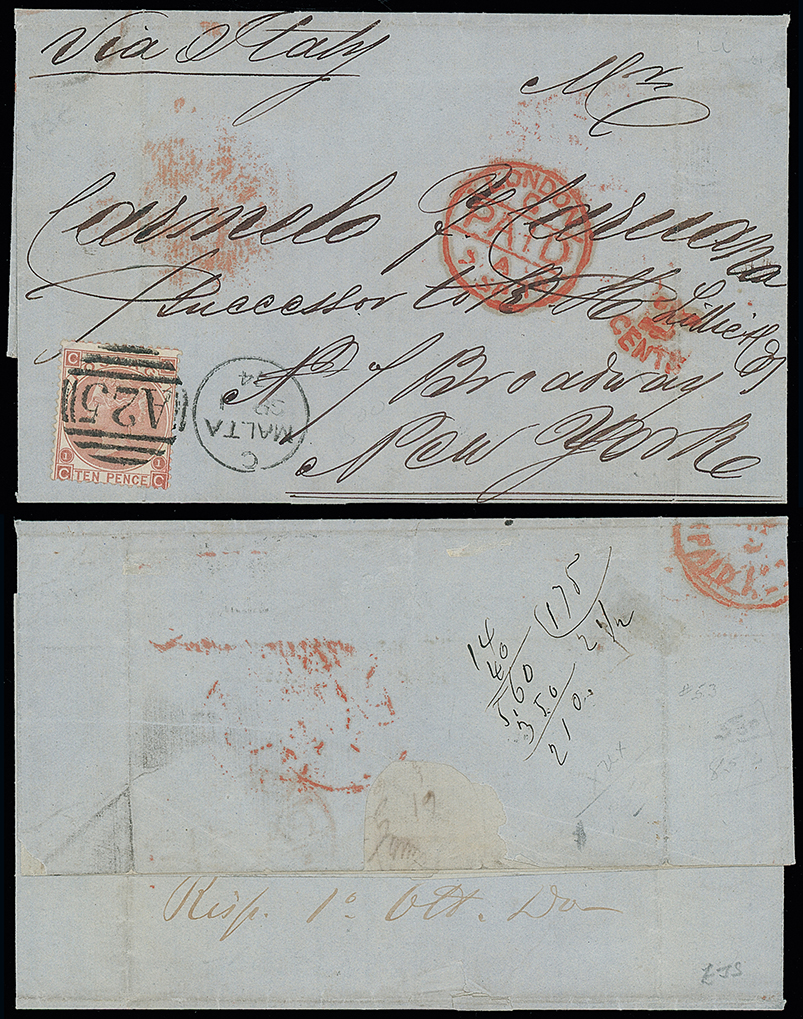 Malta: A25 Cancellations: Covers: 1869 (Sept. 1) entire letter “via Italy” to New York franked 1867 10d. plate 1 tied by “A25” duplex, with London transit, “2/CENTS” accountancy credit mark in red and part New