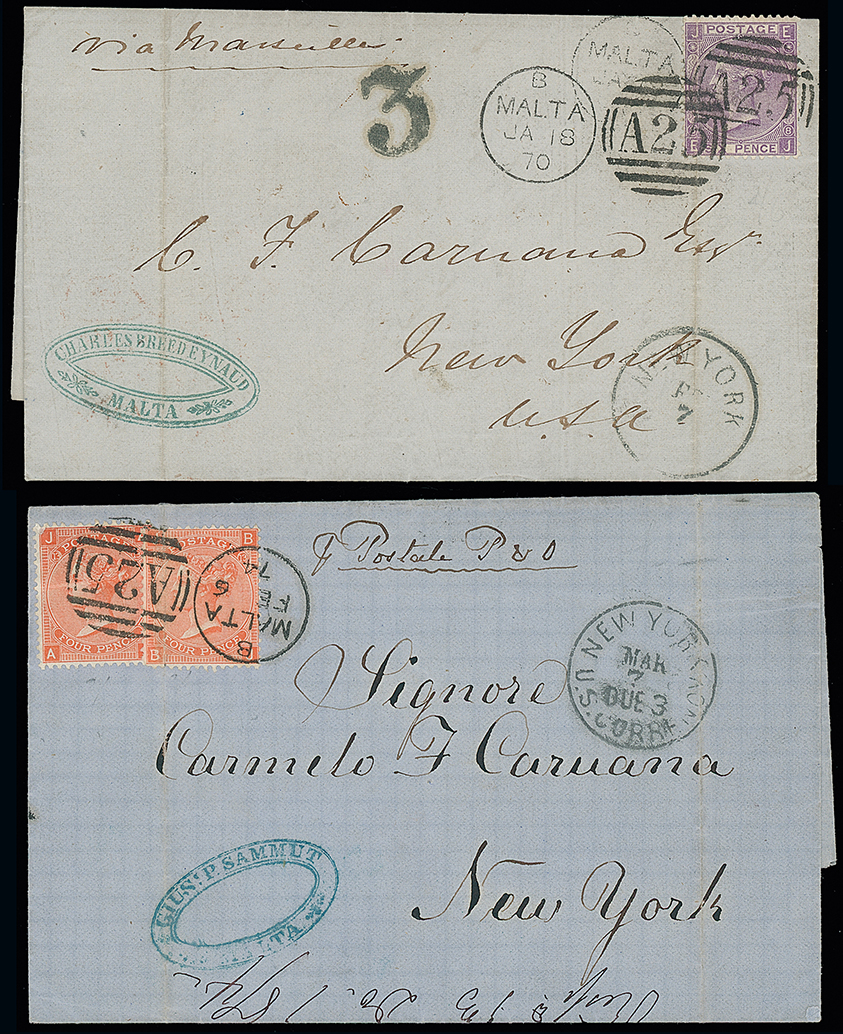 Malta: A25 Cancellations: Covers: 1870 (Jan. 18) wrapper (file folds) “via Marseilles” to New York franked 1869 6d. plate 8, underpaid for the Marseille route and with bold “3” (cents) mark in black, possibly a