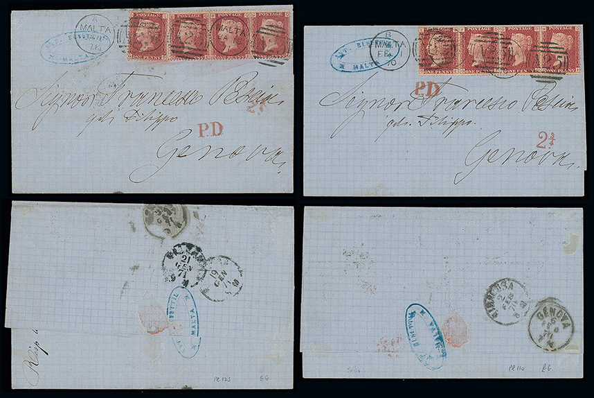 Malta: A25 Cancellations: Covers: 1870 (Feb. 1) and 1871 (Jan. 18) wrappers to the same addressee in Genoa both franked 1858 1d. strips of four plates 110 or 123 tied by “A25” duplexes, each with “P.D.” marks and