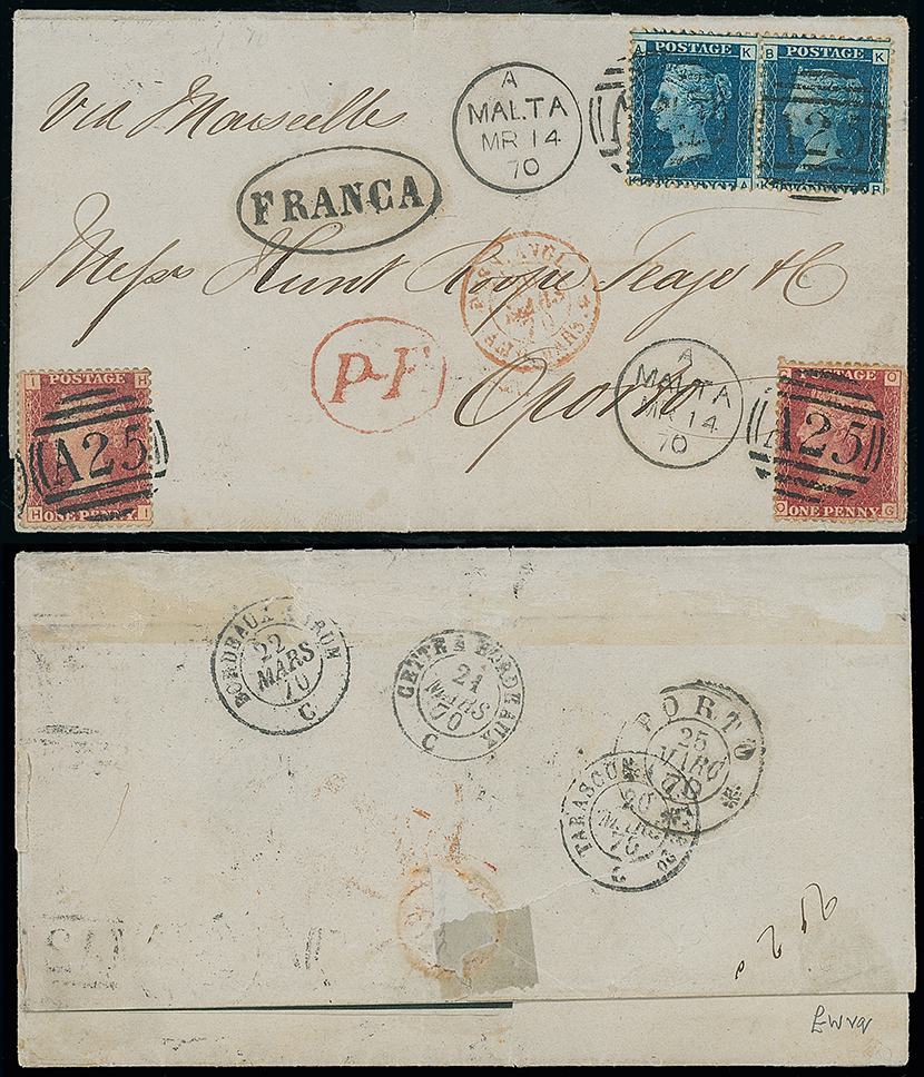 Malta: A25 Cancellations: Covers: 1870 (Feb. 18) entire letter “via Marseilles” to Oporto franked 1858-79 1d. (2, plates 83 and 125) 2d. pair plate 13 tied by “A25” duplexes with oval “FRANCA”, Marseille transit