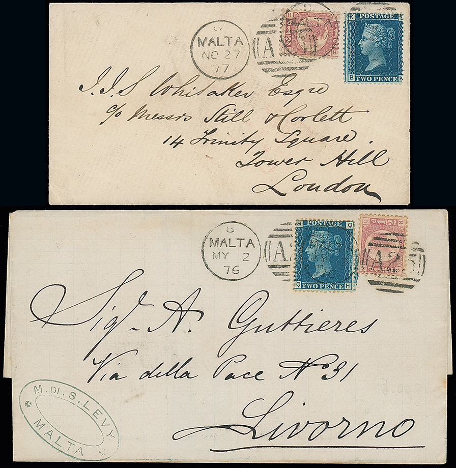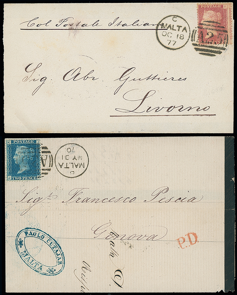 Malta: A25 Cancellations: Covers: 1876 (May 2) wrapper to Livorno franked 1870 ½d. plate 5 and 2d. plate 14 tied by “A25” duplexes and 1877 (Nov. 27) envelope to London also franked 1870 ½d. plate 13 and 1858 2d.