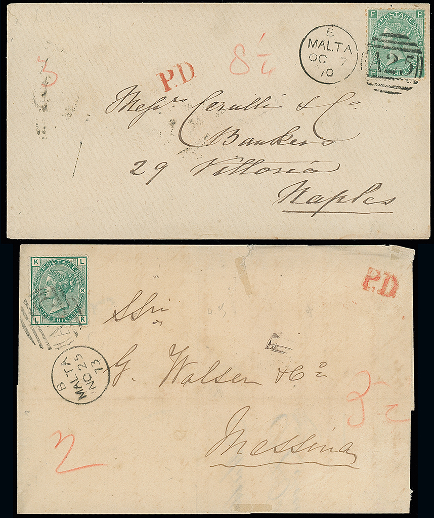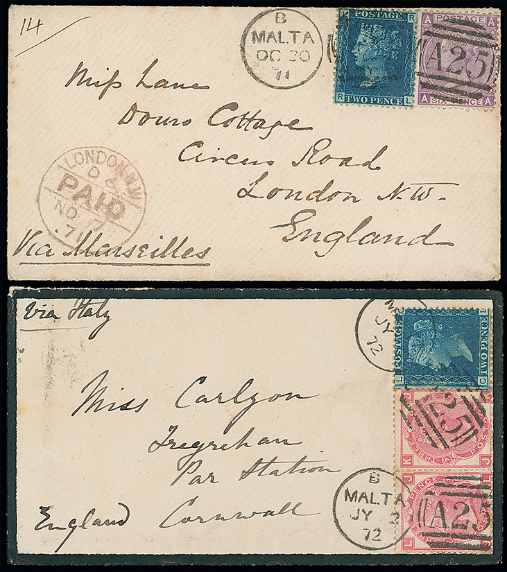 Malta: A25 Cancellations: Covers: 1870 (Oct. 7) and 1873 (Nov. 25) triple weight envelope or entire letter to Naples or Messina each franked 1867 1s. plates 4 or 8 (scarce used in Malta) and tied by “A25”