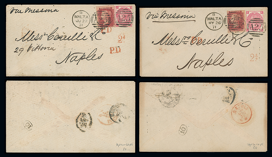 Malta: A25 Cancellations: Covers: 1871 (May 26) and (June 27) envelopes “via Messina” to the same firm in Naples both franked 1858 1d. plates 130 or 140 and 1867 3d. plates 5 or 6 tied by “A25” duplexes, each with