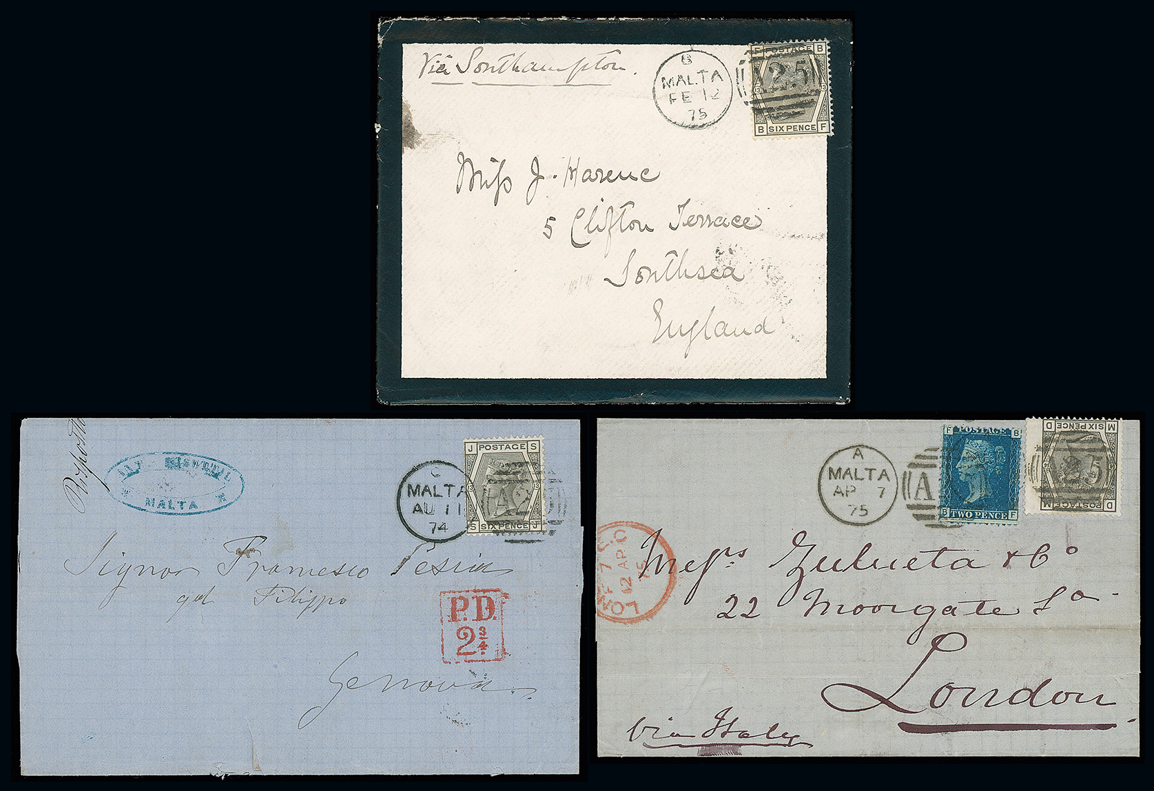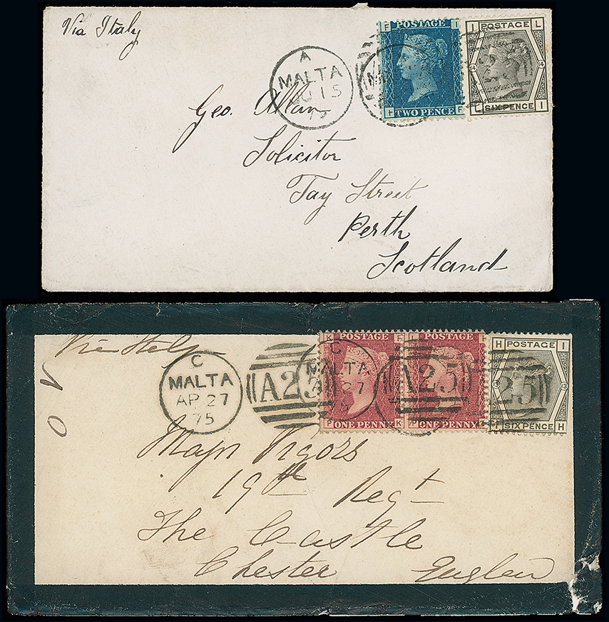 Malta: A25 Cancellations: Covers: 1875 (Apr. 27) mourning envelope “via Italy” to Chester franked 1864 1d. rose-red pair plate 157 and 1873 6d. grey plate 13 tied by “A25” duplexes and 1875 (June 15) envelope to