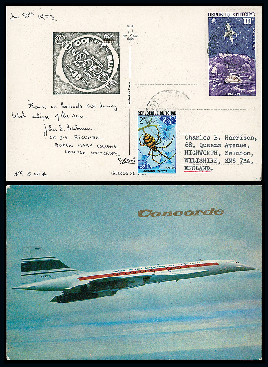 145 c, entire, etc. imageConcorde: 1973 (June 30) Total Eclipse of the sun flight by 001. Scientists from France and U.S.A., were given mankind’s longest ever look at a total eclipse, flown from Las Palmas to Fort Lamy, endorsed “no. 3 of 4”. Photo. (Image1)