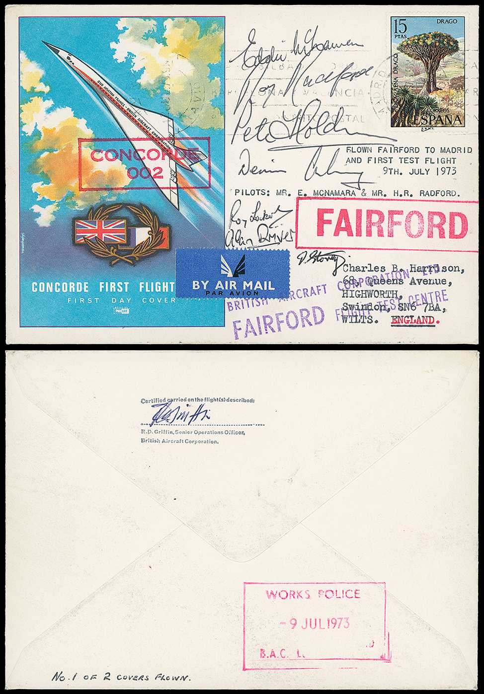 147 c, entire, etc. imageConcorde: 1973 (July 9) High Temperature Trials, 002 Fairford to Madrid flown postcard pilot signed and a cover pilot-signed. Photo. (Image1)