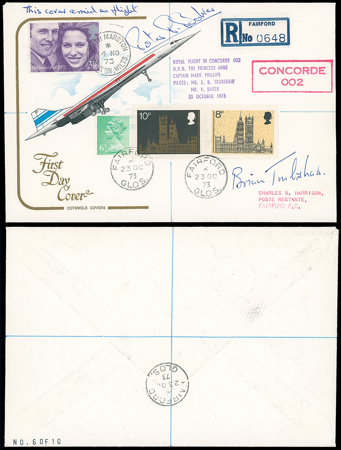 148 c, entire, etc. imageConcorde: 1973 (Oct. 23) to 2003 (June 17) Royal Flights, registered cover Oct. 23 1973 Princess Anne and Capt. Mark Phillips Flight signed Brian Trubshaw and and co-pilot Peter Baker, one of ten flown. Photo. (Image1)