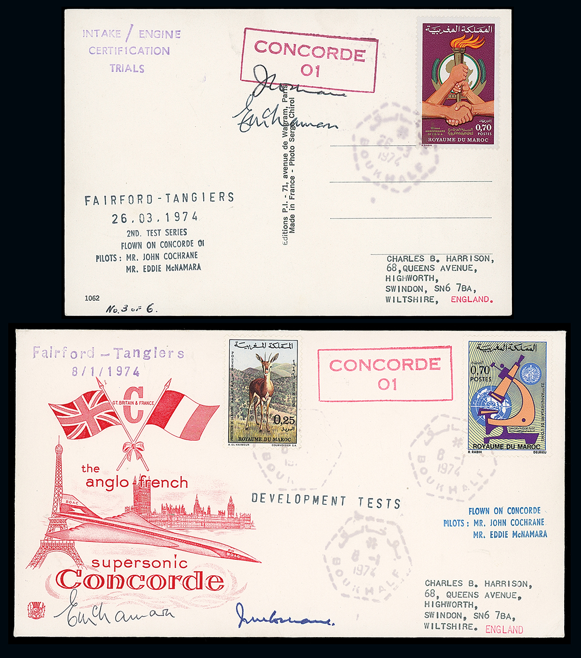 150 c, entire, etc. imageConcorde: 1974 (Jan. 8, Mar. 26) Series of Air Intake System Trials, Fairford-Tangier, flown cover and card, signed by both pilots, only four flown. Photo. (Image1)