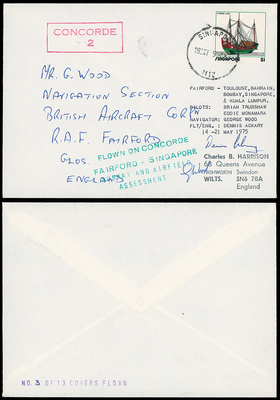 152 c, entire, etc. imageConcorde: 1974 (May 14-18) Runway and Airfield assessment flight from Fairford to Singapore, signed by the Navigator and Chief Engineer, only 13 carried. Photo. (Image1)