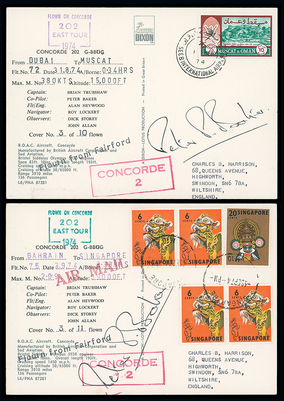 153 c, entire, etc. imageConcorde: 1974 (Aug. 31–Sept. 3) Middle and Far East Development Tour, card from Dubai to Muscat (3/10), and card from Bahrain to Singapore (/11), both signed by co-pilot Peter Baker. Photo. (Image1)
