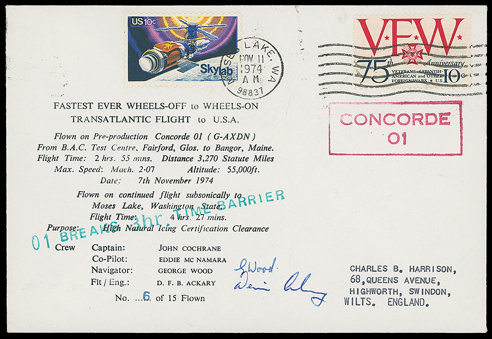 156 c, entire, etc. imageConcorde: 1974 (Nov. 7) Fastest Transatlantic flight, cover from Fairford-Bangor-Maine, (6/15), signed by Navigator and Flight engineer. Photo. (Image1)
