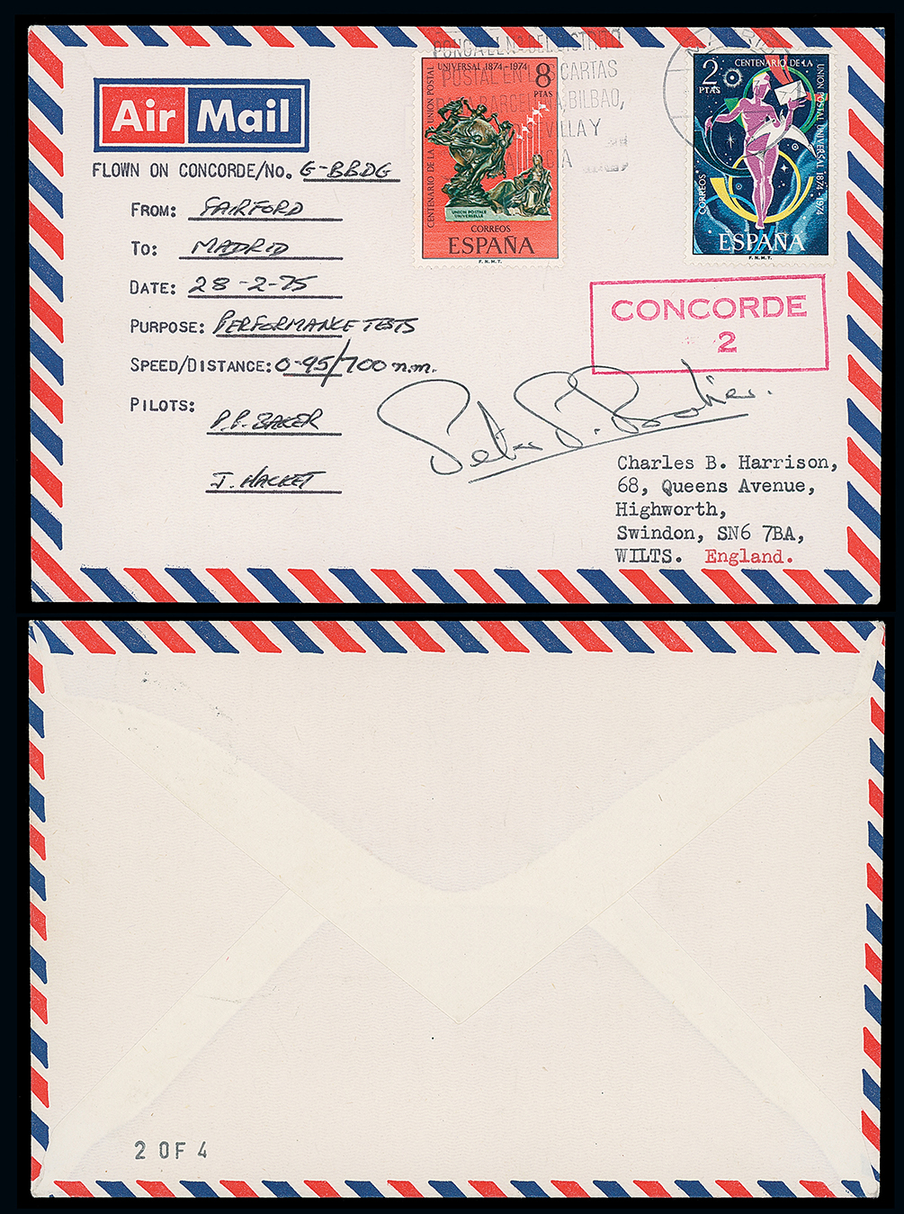 159 c, entire, etc. imageConcorde: 1975 (Feb. 28) Take off and Landing tests, cover from Fairford to Madrid, signed by the pilot Peter Baker, number 2 of 4 carried. Photo. (Image1)