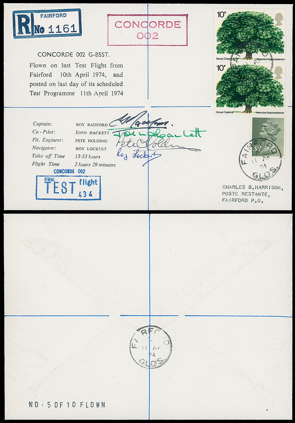 151 c, entire, etc. imageConcorde: 1974 (Apr. 10) Final Test Flight, No. 434, of Britain’s Prototype 002, one of just ten registered covers flown and signed by the four man crew. Photo. (Image1)