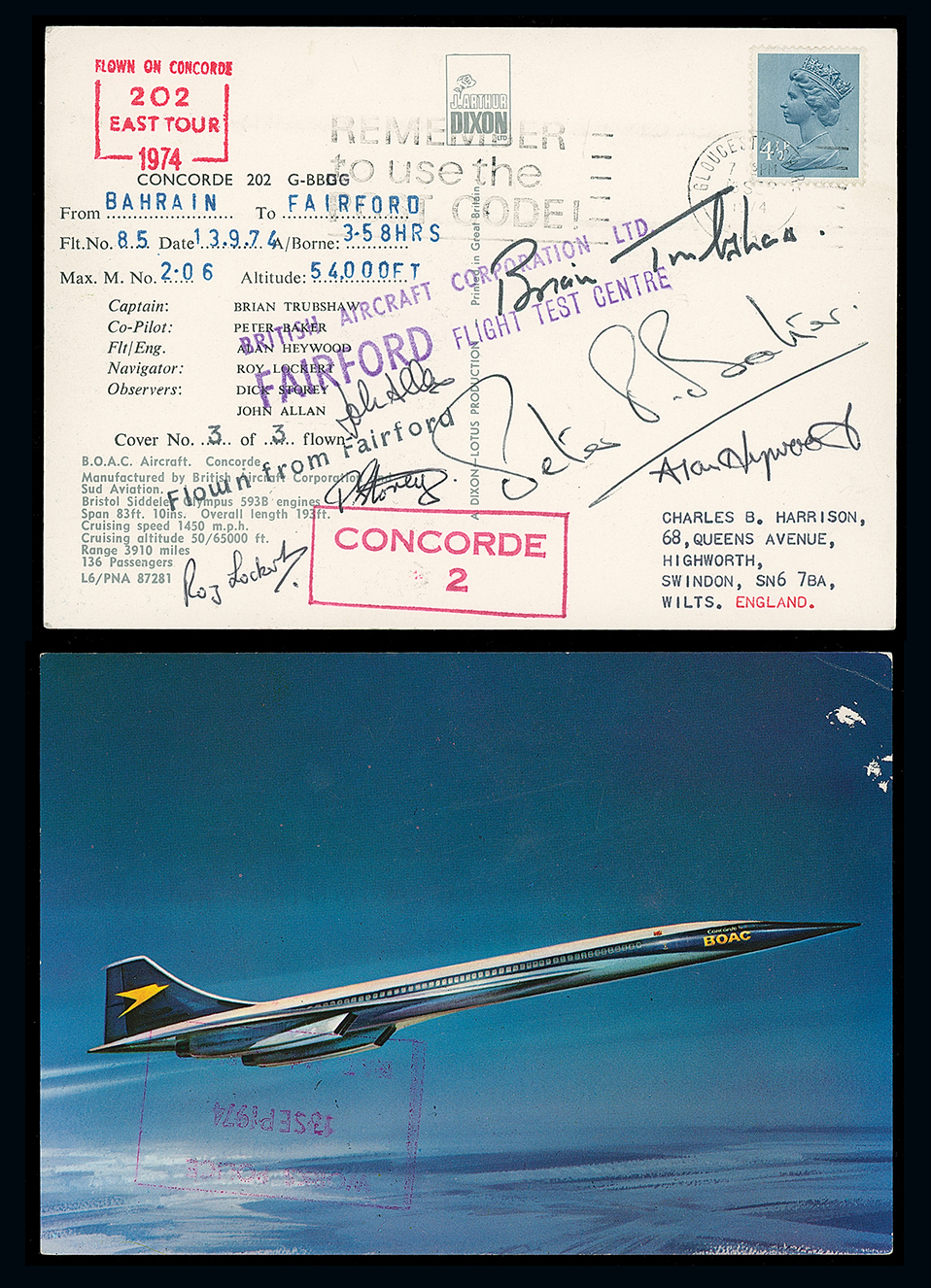154 c, entire, etc. imageConcorde: 1974 (Sept. 13) Bahrain-Fairford card, crew signed. Number 3 of 3 flown. Photo. (Image1)