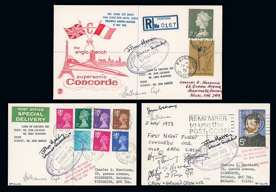 144 c, entire, etc. imageConcorde: 1973 (May 2-17) Prestwick-Artic Circle two cards and cover, one pilot signed, one signed by senior scientist John Harris. Number 4 of four flown. (Image1)