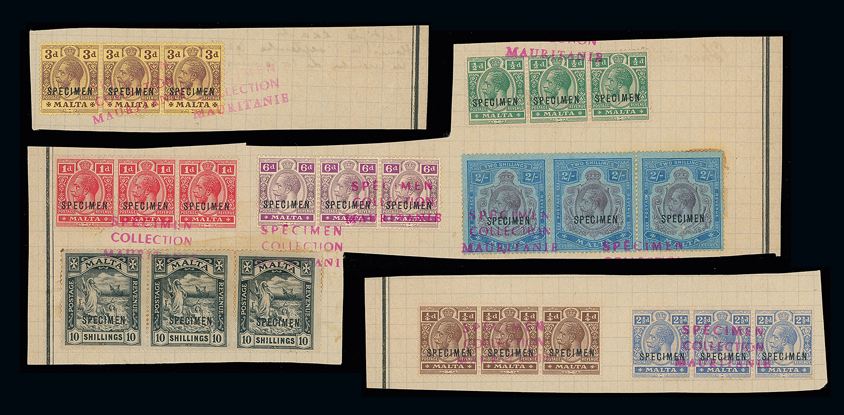 Malta: Issued Stamps: King George V: 1921-22 Watermark Mult Script CA 1/4d. to 10s. set in strips of three, overprinted “SPECIMEN”, affixed to three pieces of ledger page from the U.P.U. Specimen Archives of the