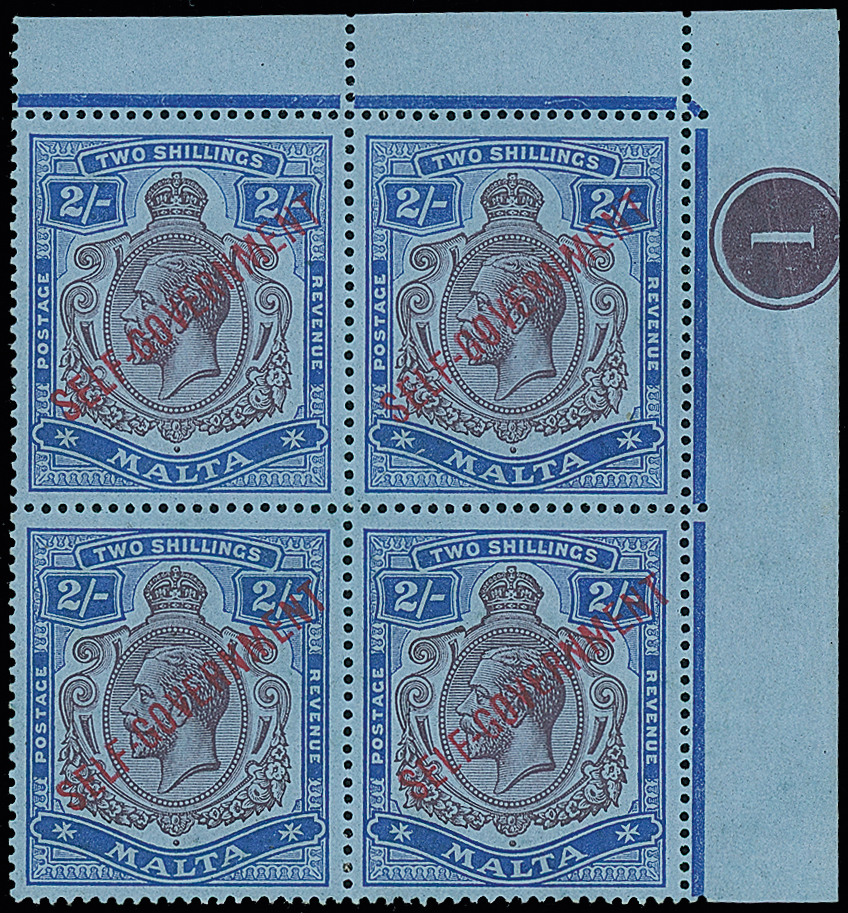 Malta: Issued Stamps: King George V: 1922 “SELF-GOVERNMENT”, Watermark Mult. Crown CA 2s. purple and blue on blue variety broken crown and scroll in corner plate block of four, mint with stamps unmounted, fine and