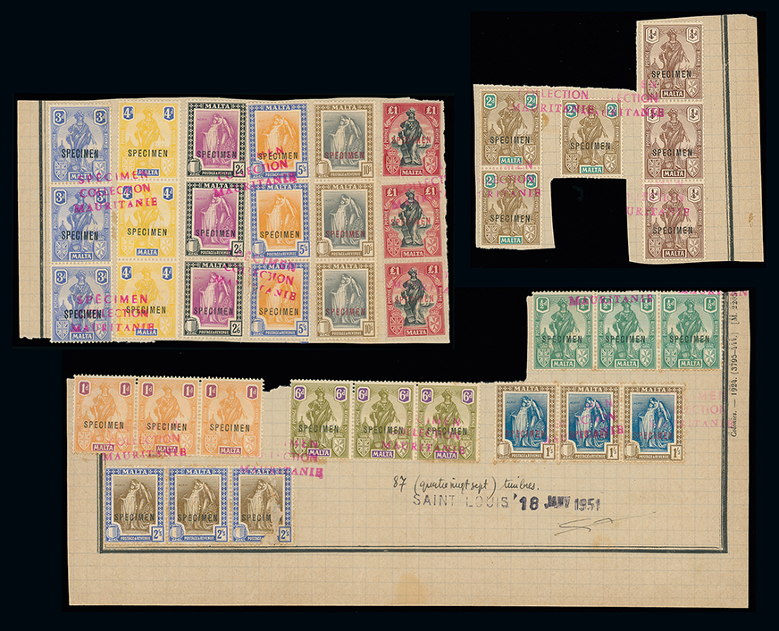 Mauritania Post Office, cancelled by three line “SPECIMEN/COLLECTION/MAURITANIE” in red, a few faults, otherwise fine and unique. Photo.