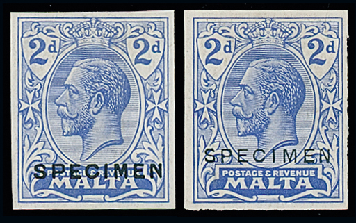 Malta: Issued Stamps: King George V: Key Plates, Proofs, 2d. imperforate colour trials (2) in blue, overprinted “SPECIMEN” (Samuel type DS1) with thick and thin letters, on ungummed watermarked paper, fine. (2)