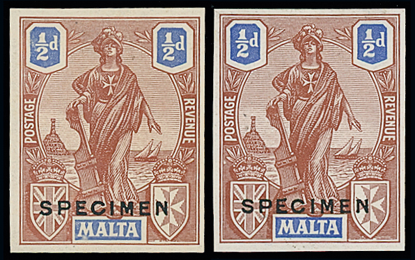 Malta: Issued Stamps: King George V: 1922-26 Melita, Colour Trials, 1/2d. imperforate colour trials (2) in brown and blue, on unwatermarked paper, overprinted “SPECIMEN” (Samuel type DS1), fine. (2) Photo. (Image1)